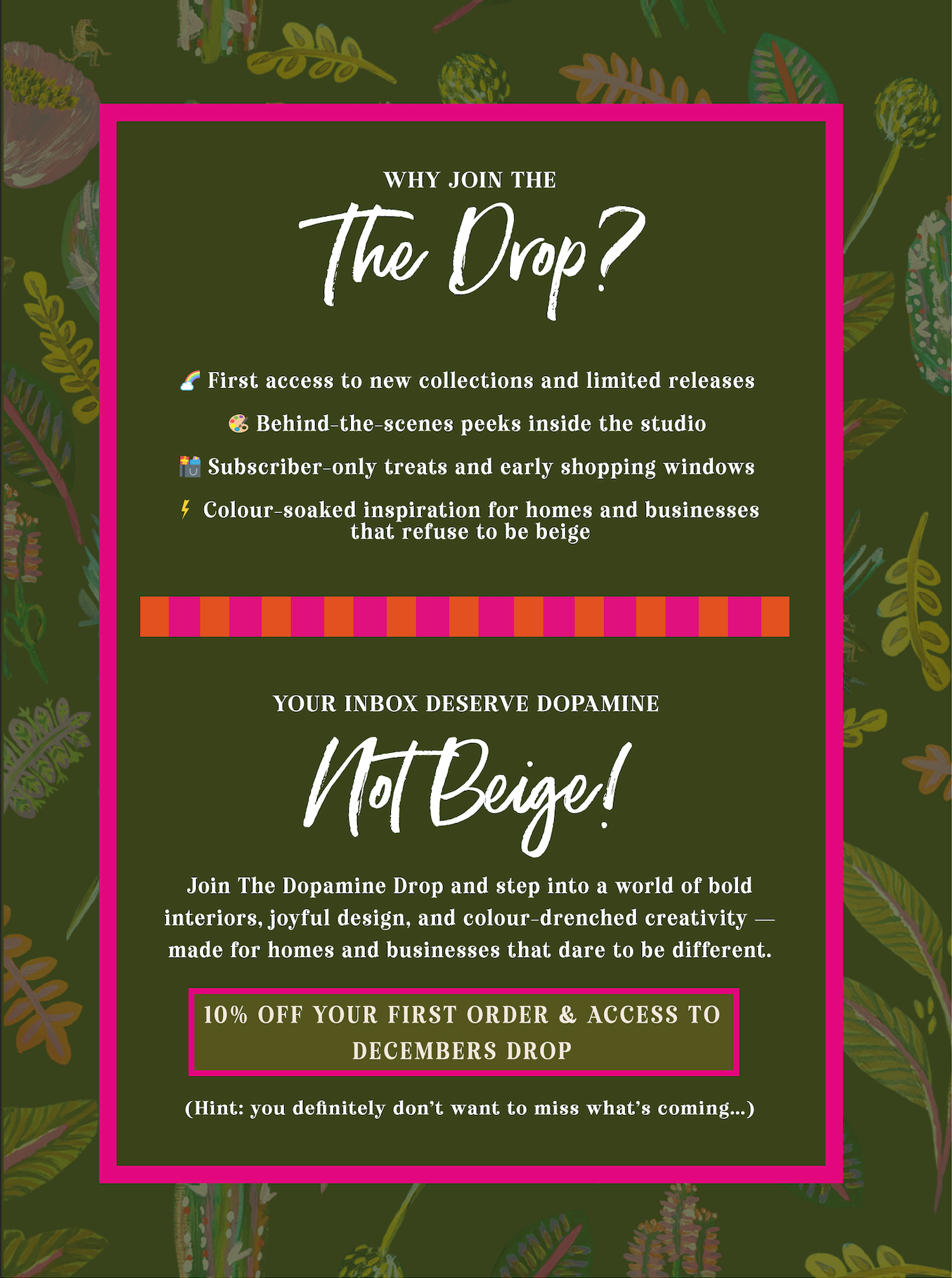 Be the first to experience new Dopamine Design Co. launches — bold drops, one-off pieces, studio secrets, and colourful interior inspiration delivered straight to your inbox. Join today and get 10% off your first order.